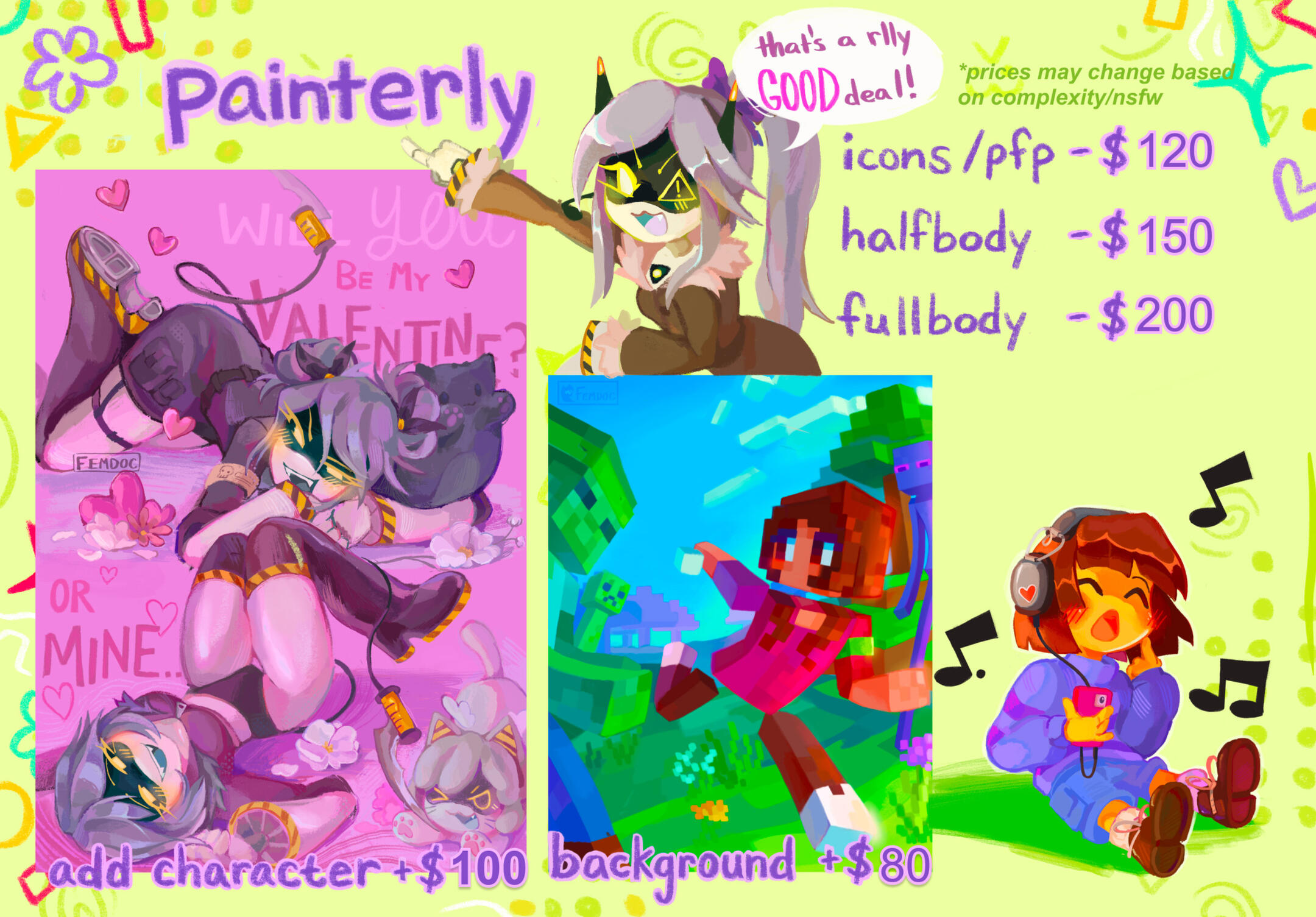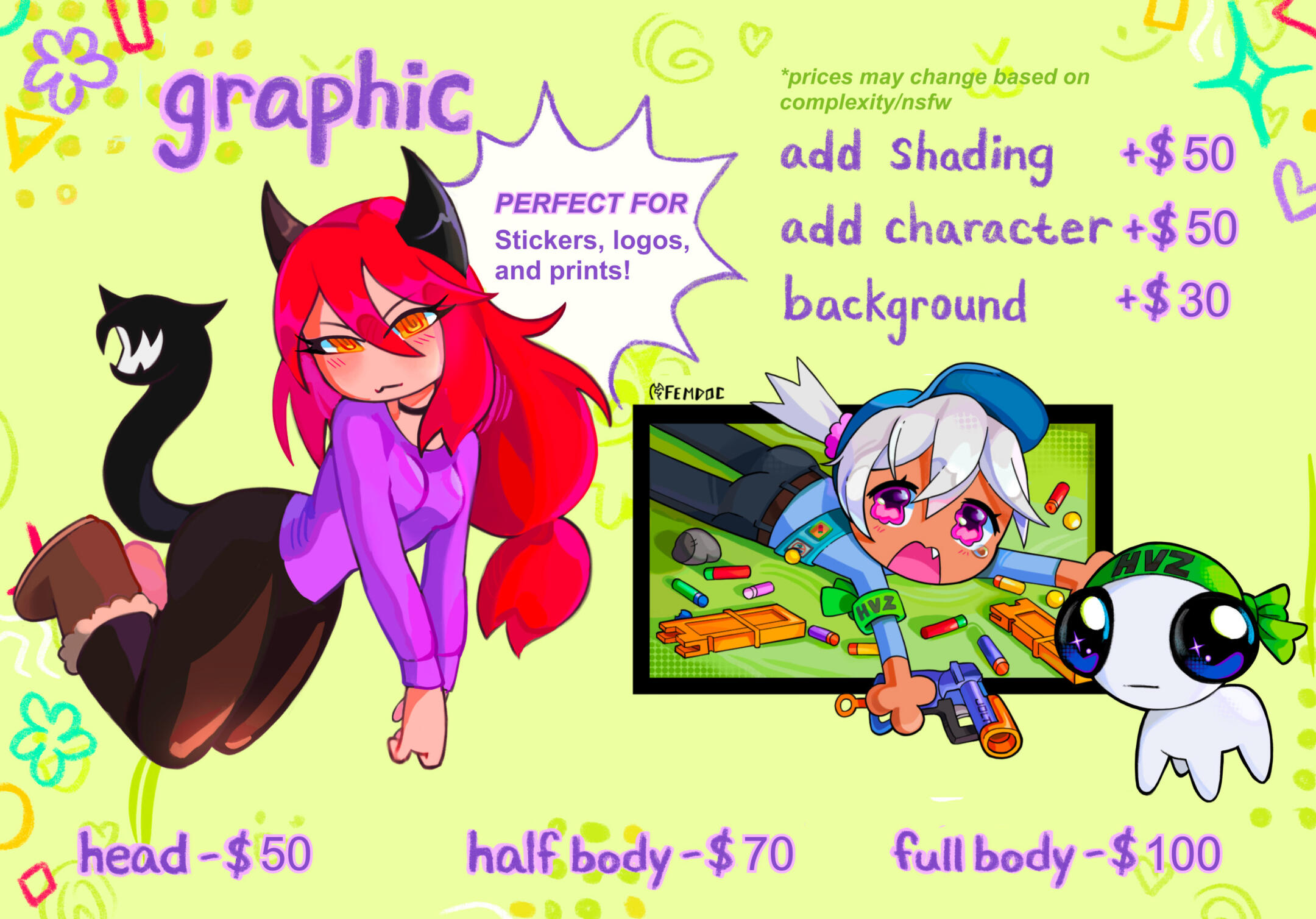 | USAGE | Personal use only! With exceptions ⭑.ᐟ When reposting online, you must credit me @femdoc ⭑.ᐟ If you want to use my art commercially, I must explicitly agree to this. ⭑.ᐟ I will post the commission on my account, unless specified not to. |